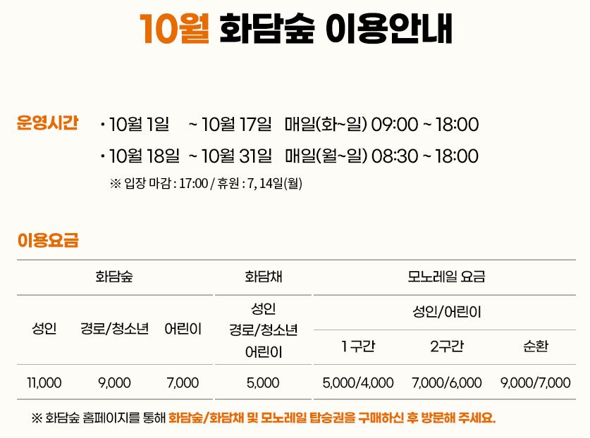| 예매 가능 상품 | 화담숲 입장권, 화담채 입장권, 모노레일 탑승권 (1승강장 출발) | |