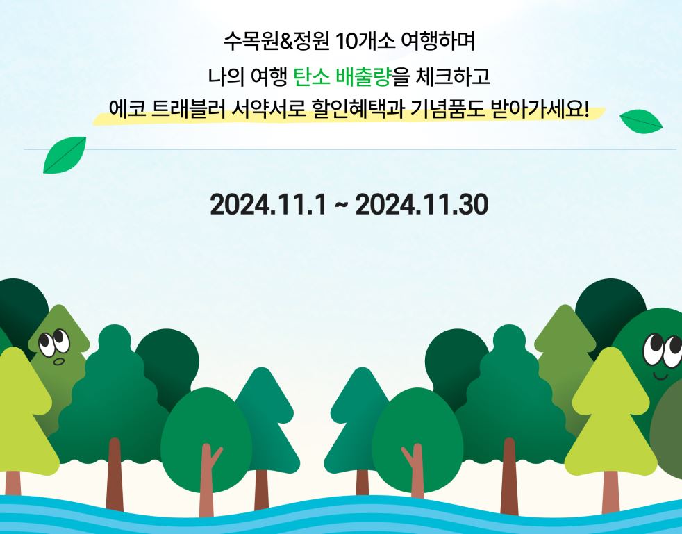 이번 이벤트는 수목원 & 정원 10개소를 여행하며 나의 여행 탄소 배출량을 체크하고 에코 트래블러 서약서로 할인혜택과 함께 기념품도 받아갈 수 있는 이벤트입니다. 평소 숲이나 수목원 여행을 좋아하시는 분들은 물론이거니와, 가을을 맞아 아름다운 단풍숲을 즐기고 싶은 분들에게도 좋은 의미의 여행이 되지 않을까 생각됩니다.