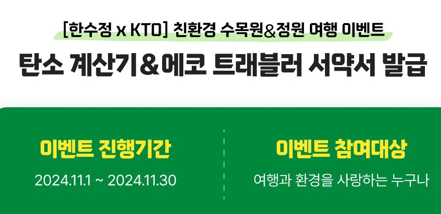 오늘은 가을을 맞아 여행을 계획하시는 분들에게 친환경 정원 여행 이벤트가 있어서 소개해 드립니다. 바로 한국수목정원관리원과 한국관광공사(KTO)가 함깨하는 특별한 친환경 수목원 & 정원 여행 이벤트인데요, 가을의 절정이라고 할 수 있는 11월에 진행되는 이벤트이고 환경을 생각할 수 있는 여행 이벤트라서 많은 혜택이 있으니 상세 내용 살펴보시고 꼭 한번 참여해 보시기 바랍니다. 그러면 이벤트 내용에 대해 자세히 살펴보겠습니다.