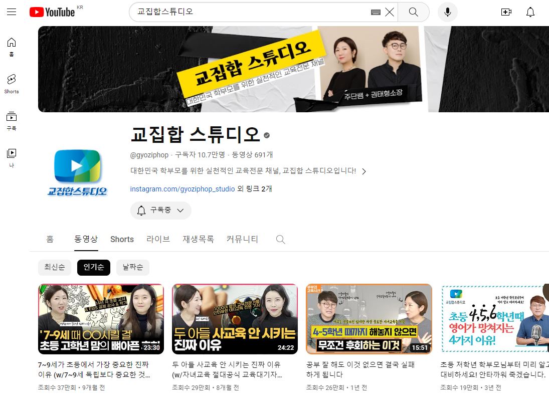 앞서 이야기했듯이 저는 아이가 저학년 때 집에서 저와 함께 학습을 하면서 도서관에서 여러 교육서들을 찾아서 읽고, 또 도움이 되는 책들은 구매해서 읽기도 했는데요, 교집합 스튜디오는 그때 제가 책으로 먼저 만났던 저자분들이 운영하시는 채널이었습니다.
