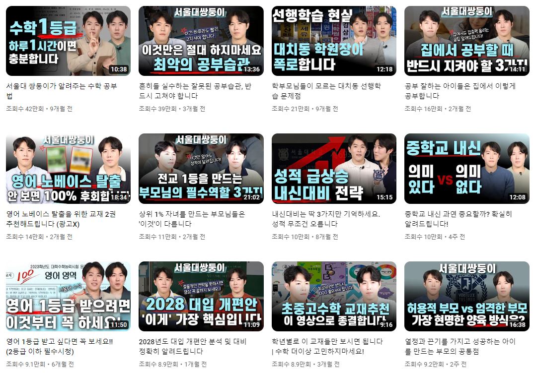 중고등 학생이 있는 학부모분들이나 공부법에 대한 영상을 찾아보신 분들이라면 한번쯤 보신적이 있는 서울대쌍둥이 채널은, 채널 이름처럼 서울대학교 출신의 쌍둥이인 여호원, 여호용 두 선생님이 운영하십니다.