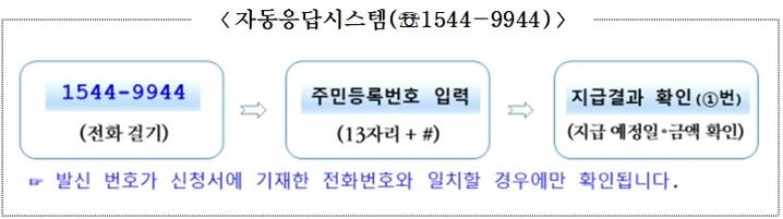 핸드폰이나 컴퓨터 사용이 힘드신 분들은 자동 응답 시스템으로 확인도 가능하다고 합니다. 1544-9944로 전화를 걸고 안내에 따라 주민등록 번호 13자리를 누른 후 #버튼을 누릅니다. 다음으로 안내되는 메뉴 중에 1번을 누르면 지급 예정일과 금액을 확인하실 수 있습니다.