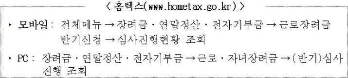 - 모바일 : 전체 메뉴 → 장려금, 연말정산, 전자 기부금 → 근로장려금 반기 신청 → 심사진행 현황 조회