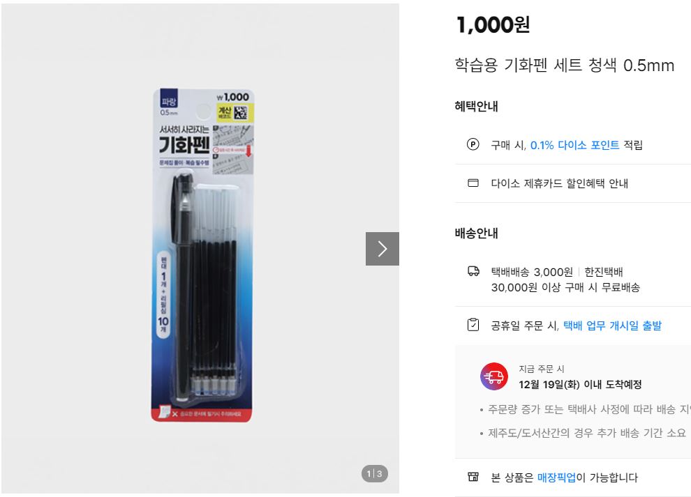 배송비의 경우는 3만 원 미만 구매 시 3,000원이고 3만 원 이상 구매 시 무료로 배송가능 합니다. 현재 다이소몰에서는 다이소몰 첫 방문 고객에게 배송비 50% 쿠폰을 2장씩 발행하고 있으니 다운로드 하셔서 배송비 혜택 누려 보시기 바랍니다.