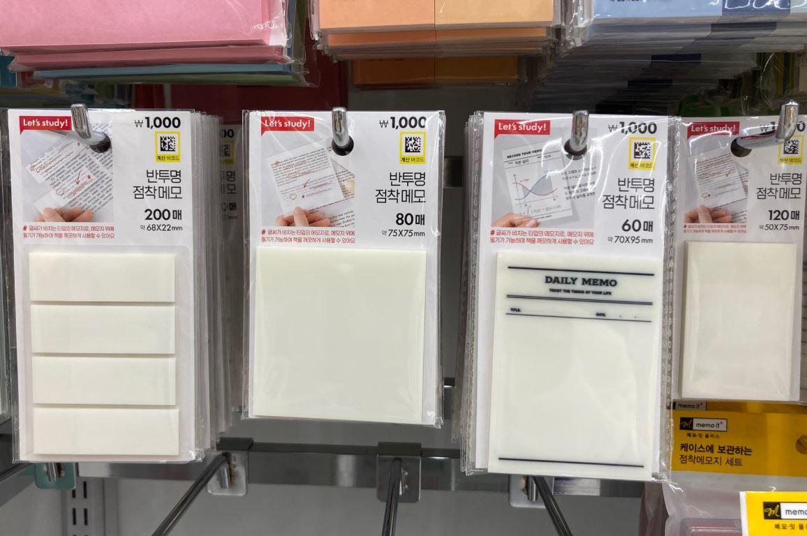 처음에 저와 아이는 온라인 문구숍에서 비싼 비용으로 주문해서 사용했었는데요, 다이소에서 천 원으로 다양한 사이즈의 반투명 접착 메모지가 있어서 너무 반가웠습니다. 사이즈가 다양하고 매수도 넉넉하니 꼭 한번 이용해 보시기 바랍니다.