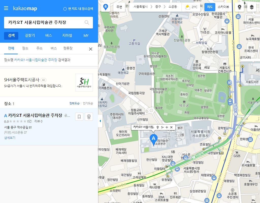 차량으로 방문 시 덕수궁에는 별도의 주차장이 없습니다. 주변 주차장으로는 덕수궁 돌담길을 마주하고 있는 서울시립미술관 주차장이 10분에 800원으로 이용 가능한데 제휴사 할인도 가능하고, 다둥이, 경차, 저공해 차량의 할인 또한 가능해서 저렴하게 이용할 수 있습니다.