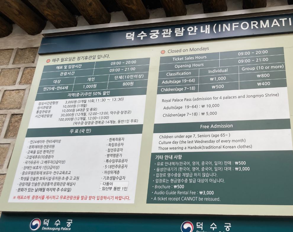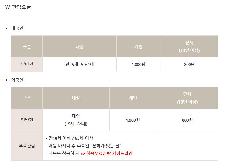 입장료는 만 25세부터 만 64세의 개인은 1,000원, 10인 이상의 단체는 800원입니다. 만 24세 이하 및 만 65세 이상 내국인의 경우는 무료입장이 가능하고, 매월 마지막 주 수요일 “문화가 있는 날”의 경우, 그리고 한복을 착용하신 관람객의 경우 무료로 관람이 가능합니다. 또한 중구 주민의 경우 50% 할인 혜택도 있으니 참고하시기 바랍니다.