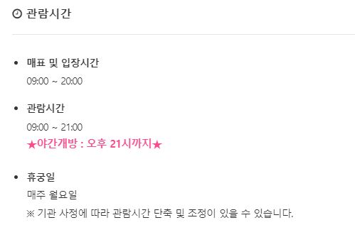 덕수궁은 오전 9시부터 오후 9시까지 운영하고 입장마감 시간은 오후 8시까지입니다. 중명전은 오전 9시 30분부터 오후 5시 30분까지이고 입장마감 시간은 오후 5시까지입니다. 매주 월요일은 정기휴일로 운영하지 않으며 석조전 내부는 예약 후 관람이 가능하니 유의하시기 바랍니다.