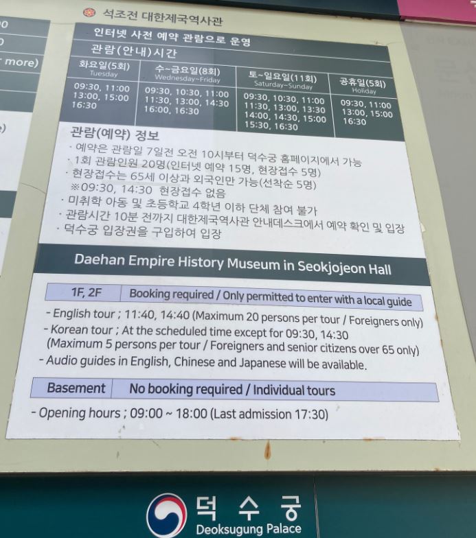 1, 2층 사전예약 관람은 덕수궁 누리집(www.deoksugung.go.kr)에서 예약이 가능한데, 선착순으로 예약이 이루어지고, 1인당 최대 5매까지 예약할 수 있습니다. 관람일 일주일 전 오전 10시부터 예약 가능하고, 평일은 9회차 주말은 11회차까지 회차당 15명에서 20명까지 예약이 이루어집니다.