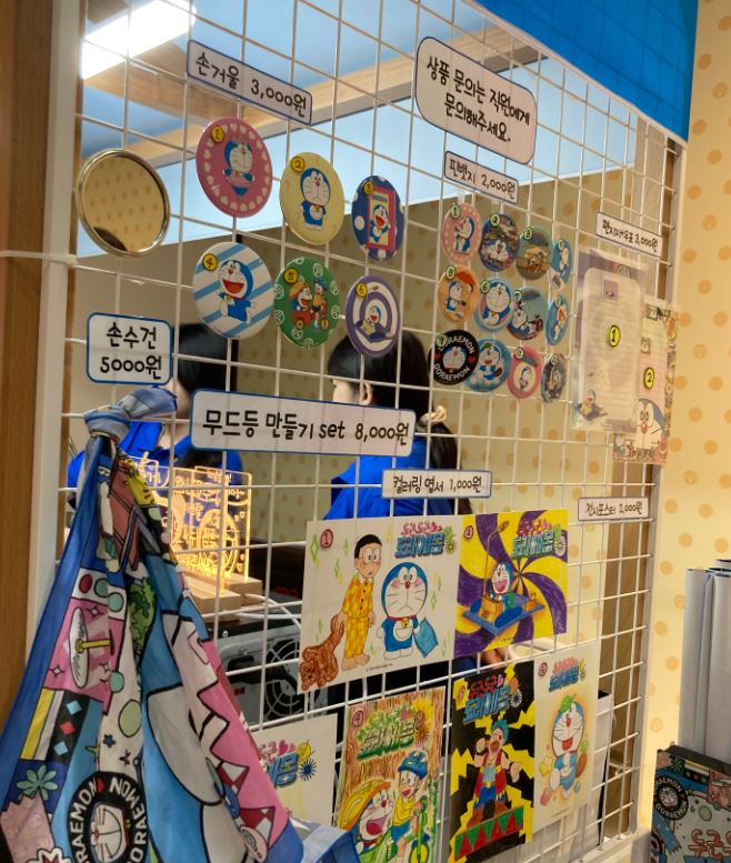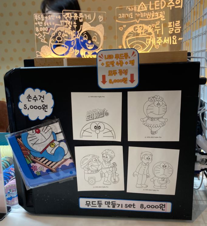 마지막으로 도라에몽 친구들이 노는 공터 공간이 지나면 전시가 마무리되고 워크샵 존이 나옵니다. 이곳에서는 체험이 이루어지고 있는데, 무드등 만들기 세트가 8,000원, 컬러링 엽서는 1,000원에 판매하고 있어서 구입해서 현장에서 체험도 가능합니다. 그 외 핀뱃지, 손거울, 손수건, 편지지, 전시 포스터 등도 판매하고 있으니 참고하시기 바랍니다.