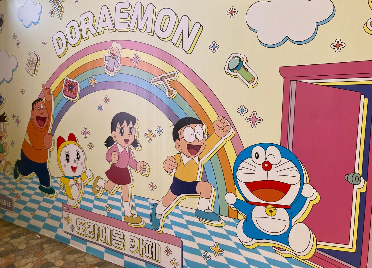 용산 아이파크몰에 도착하면 외벽에서부터 쇼핑몰 구석구석을 비롯해서 에스컬레이터까지 도라에몽 전시를 홍보하고 있어서 누구나 관심을 가질 만합니다. 전시회장 안으로 들어가지 않아도 매표소를 기준으로 곳곳에 대형 도라에몽을 전시하고 있고, 전시회장 앞쪽으로는 도라에몽 테마 카페가 있어서 입장 전이나 후에 방문해 볼만합니다.