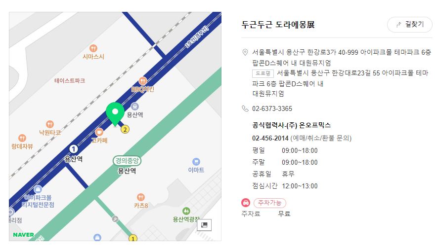 도라에몽 전시회 <두근두근 도라에몽 展>은 현재 서울 중심인 용산에서 열리고 있습니다. 주소는 서울시 용산구 한강 대로 23길 55 아이파크몰 테마파크 6층 팝콘 D 스퀘어 내 대원 뮤지엄에서 진행하고 있고, 문의처는 02-6373-3365입니다. 대중교통 이용 시 4호선, 1호선 용산 역사 내이고, 버스 역시 용산역 및 신용산역으로 오시면 됩니다.