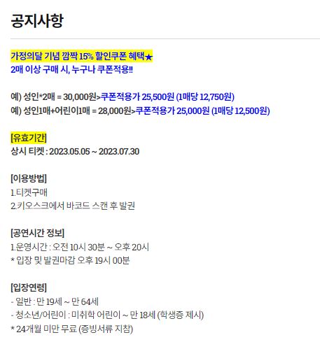 위메프의 경우 공연 티켓 사이트에서 가정의 달 기념으로 할인쿠폰을 발행하고 있는데 3만 원 이상 4,500원, 2만 원 이상 3,000원, 1만 원 이상 1,000원 쿠폰을 발행하고 있어서 모두 다운로드 하신 후 방문 인원에 맞춰서 쿠폰을 사용하실 수 있습니다. 저는 성인 2명과 아이 1명 티켓을 성인 2명 3만 원 이상 4,500원 할인으로 25,500원에, 그리고 아이 1명 1만 원 이상 1,000원 할인으로 12,000원에 발권하여 총 5,500원을 할인받고 예매하여 이용했습니다.