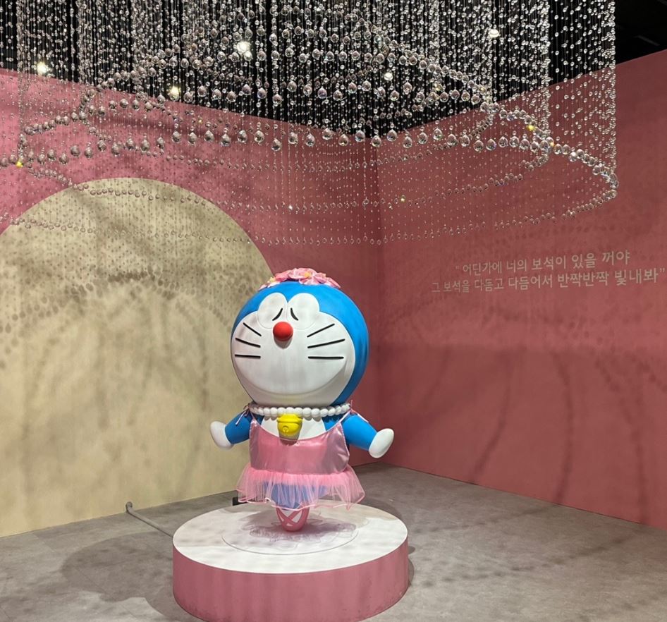 여러 테마의 전시가 이어지는데 가장 먼저 입구에서 도라에몽이 각국의 언어로 인사하면서 전시가 시작되고, 이어서 도라에몽 발레 존, 애니메이션 컷 존, 도라에몽과 진구 포토존이 이어집니다. 테마마다 가벽으로 분리가 되어있어서 사진을 촬영하기에 좋고, 전시 퀄리티가 생각보다 좋아서 아이들도 어른들도 즐거워했습니다.