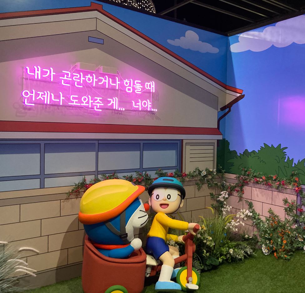 이어지는 도라에몽 시소에서는 도라에몽과 함께 시소의 맞은편에 앉아 사진을 촬영할 수도 있게 되어있고, 초대형 도라에몽이 가로로 누워있는 설치물에서는 도라에몽 주머니 속으로 들어가 볼 수 있게 되어있어서 재미있는 체험과 사진촬영도 가능합니다. 타임머신 존에서는 도라에몽의 타임머신 옆자리에 앉아 볼 수도 있고, 그 외 만화 속 장면들을 재연해 놓은 많은 전시들이 이어집니다.