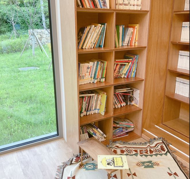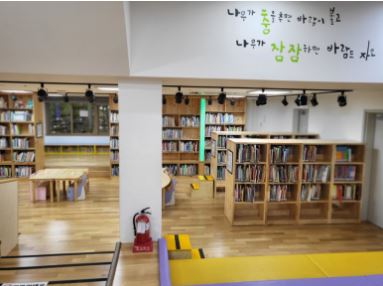 오른쪽으로는 작은 도서관이 자리하고 있는데 여러 테이블, 의자와 함께 마룻바닥으로 된 넓은 열람공간이 눈에 띕니다. 열람 공간은 전면 통유리창으로 되어 있는데 천왕산의 숲과 나무가 한눈에 들어와서 자연 속에서 책을 읽으며 마음의 위안을 얻을 수 있는 아름답고 따뜻한 공간입니다. 그 외 책 쉼터 주변으로 해먹이나 나무로 된 의자들이 조성되어 있어서 아이들이 자유롭고 편안하게 책을 즐길 수 있습니다.