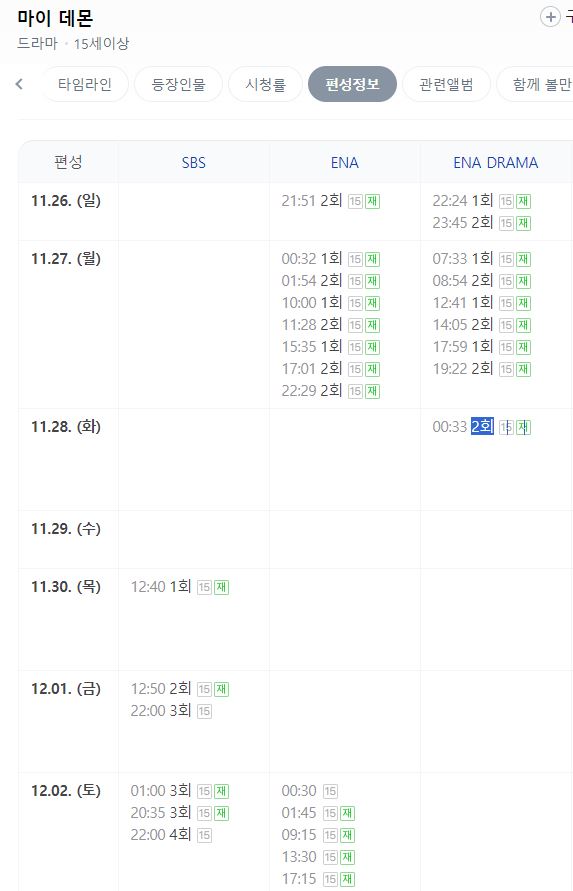 위의 1-2회 요약 영상으로도 보셔도 좋고 자세한 내용이 더 궁금하신 분들은 편성표에 재방송이 많이 잡혀 있으니 아래의 재방송 시간을 확인하셔서 다시 보셔도 좋을 것 같습니다. 앞으로의 내용이 더 궁금해지는 ‘마이 데몬’ 내용 잘 살펴보시고, 다음 주에도 재미있게 보셨으면 좋겠습니다.
