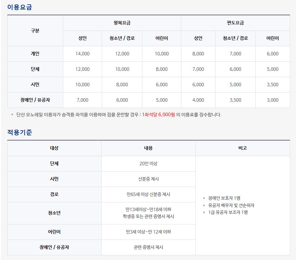 이용요금은 왕복 기준으로 성인은 14,000원 청소년과 경로의 경우 12,000원 어린이의 경우 10,000원으로 이용이 가능합니다. 20인 이상의 단체의 경우 각 2,000원의 요금이 할인이 되고, 장애인과 유공자의 경우 50% 할인된 요금으로 이용이 가능합니다.