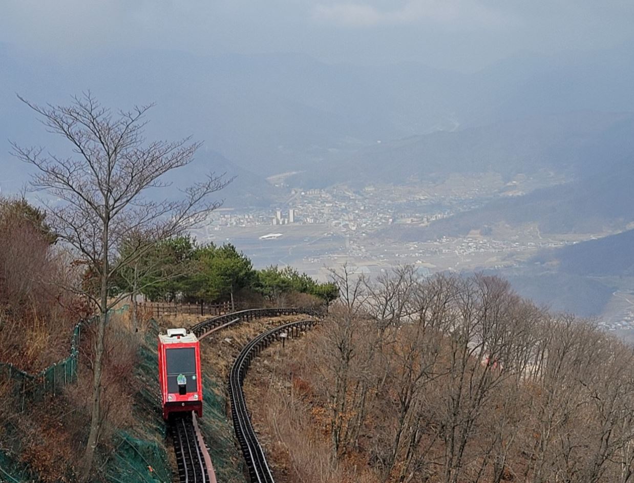 한국 관광 100선에 선정되었다고 하는 문경 단산 모노레일은 그 명성에 걸맞게 왕복 3.6km, 편도 1.8km의 긴 레일 위에 무선 모노레일이 운행하는 곳입니다. 최대 경사가 42도에 달해 올라갈 때 최고 경사 구간에서는 몸이 가로로 누워있는 듯한 느낌을 받을 수 있고, 하강 시에는 반대로 체감 상 거의 수직으로 서서 내려오는 듯한 스릴을 느낄 수 있습니다.