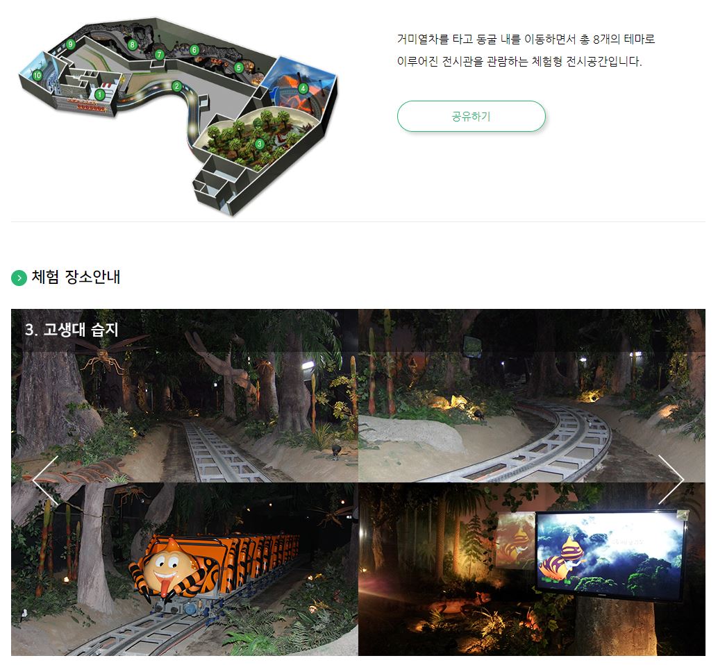 거미 열차는 거미 동굴 내를 이동하면서 총 8개의 테마로 이루어진 전시관을 관람하는 체험형 전시공간입니다. 무료로 이용할 수 있고, 신비로운 터널을 돌면서 편안하게 관람할 수 있다는 장점이 있습니다. 중간중간에 테마별로 관람이 필요할 때는 열차가 멈추어 의자가 화면 쪽으로 자동으로 돌아가기도 해서 아이들이 생각보다 좋아합니다.