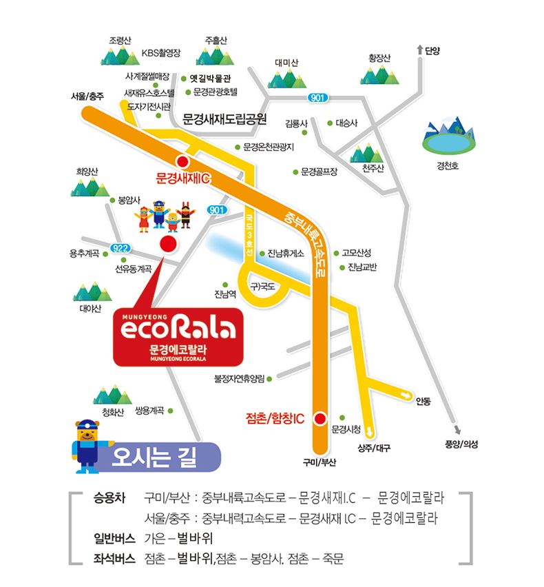 버스 이용 시 점촌 시외고속버스터미널에서 점촌, 봉암사(가은) 방면 버스를 타고 문경 에코 랄라에 내리면 되고, 기차 이용 시 증평역에서 하차하거나 충주역에서 하차하여 가은 아자개 장터터미널로 오신 후 에코월드를 찾으시면 됩니다.
