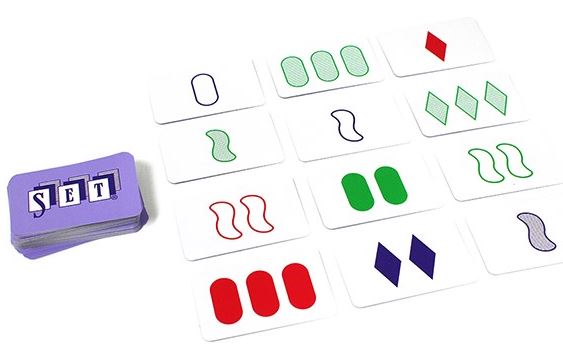게임 방법은 규칙에 맞는 세트를 찾으면 ‘set’를 외치고 세트인 3장의 카드를 가져오면 되는데, 3가지의 모양, 색깔, 개수, 음영을 가진 도형이 그려진 카드들을 이용해 세트를 완성해야 합니다. 세 장의 카드에 그려진 그림의 속성이 모두 같거나 모두 달라야 한다는 것이 그 규칙으로 아이들의 두뇌발달에도 도움이 되는 게임입니다.