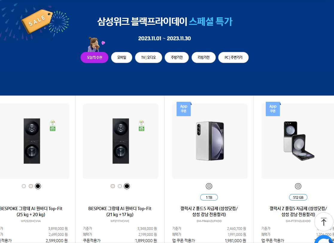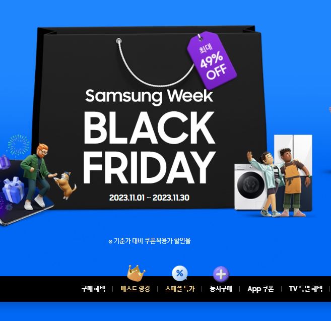 국내 대표 가전업체인 삼성전자가 연말 쇼핑 시즌을 맞이하여 ‘삼성 위크 블랙프라이데이’라는 대대적인 할인 행사에 돌입한다고 합니다. 이번 할인 전으로 최근 LG트윈스 우승 할인전보다 더 큰 할인 혜택으로 주목받고 있는데요, 세부 내용 꼼꼼히 알아보시고 비교하셔서 혜택 누리시기 바랍니다.