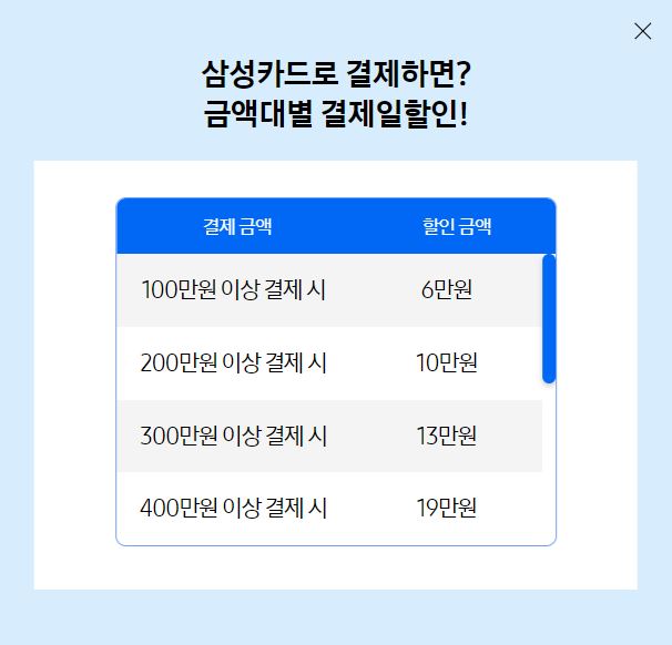 삼성카드로 결제를 할 경우에는 추가 할인도 진행됩니다. 금액대별 할인을 달리 적용해 2000만원 이상 결제는 90만 원, 1500만 원 이상 결제는 70만 원, 1000만 원 이상 결제는 50만원을 할인해 준다고 합니다.