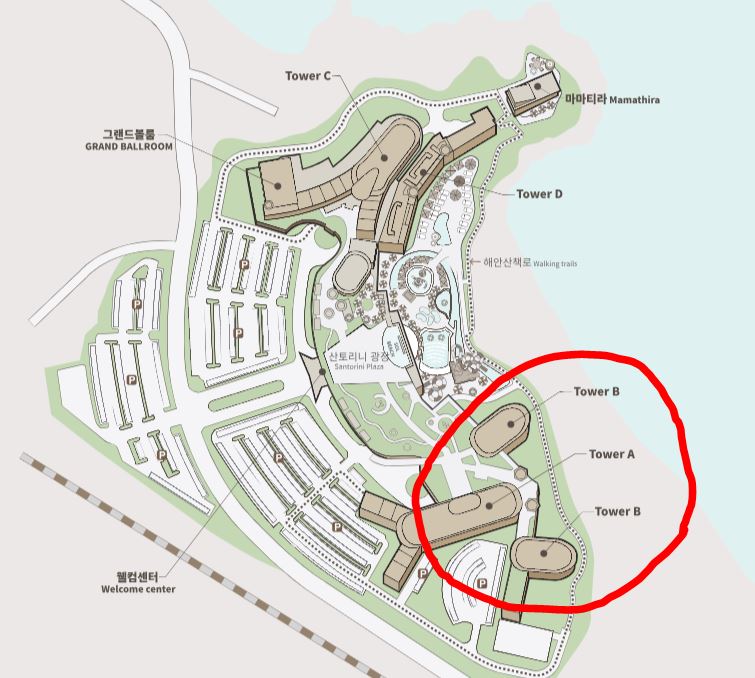 | 객실위치 구성 | B동 : 로비(5층)기준 아래로 객실구성 (최고6층) A동 : 산토리니 광장 위쪽으로 객실구성 |