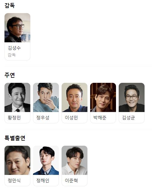 - 출연 : 황정민, 정우성, 이성민, 박해준, 김성균 등