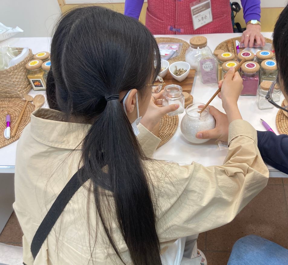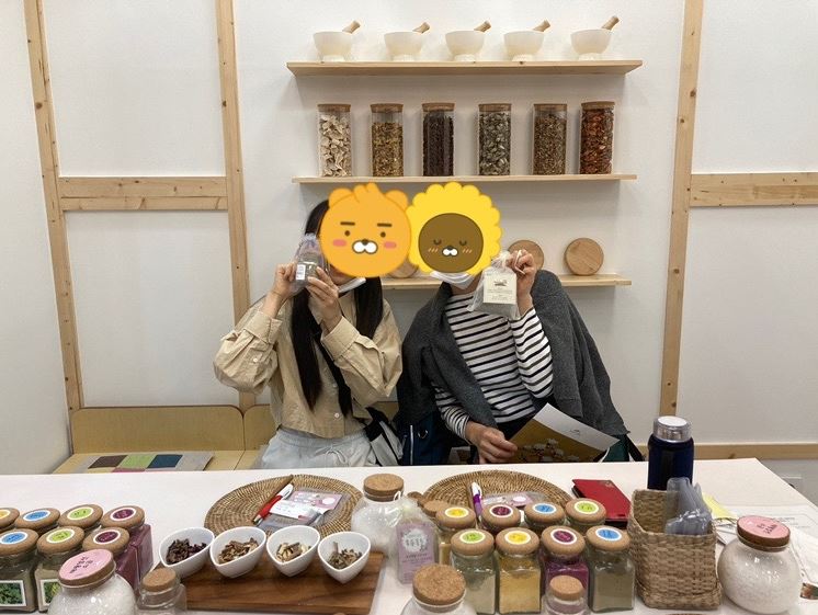 족욕 솔트도 약재들 중 몇 가지를 선택하면 솔트에 약재를 섞어서 병에 담는 과정을 체험하는 것으로 과정은 어렵지 않고, 아이들이 약재 가루들을 신기해해서 냄새도 맡고 색깔도 보면서 재미있어 했습니다.