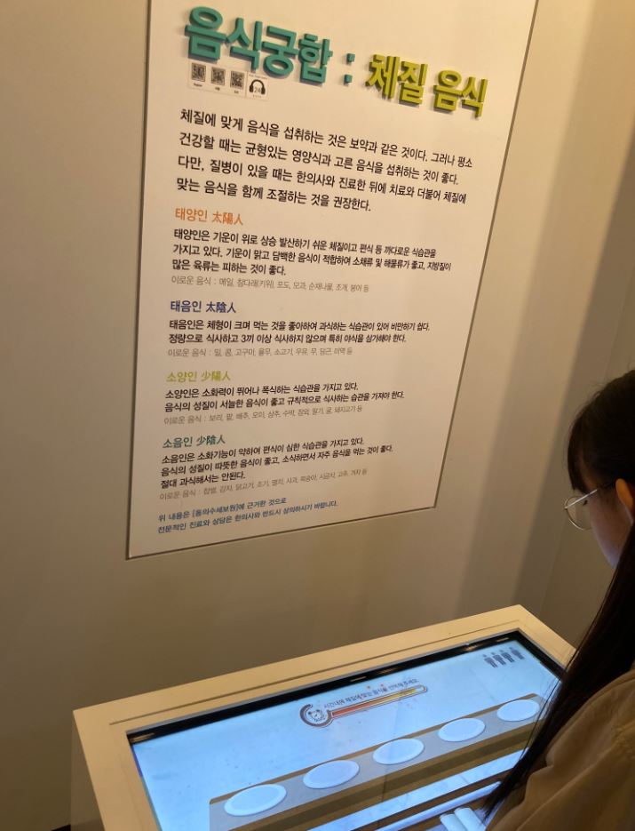 마지막으로 아이들이 가장 재미있어 했던 부분이었는데 태양인, 태음인, 소양인, 소음인으로 사상체질을 알아보고 체질에 맞는 운동과 음식을 찾아보는 체험도 함께 있어서 좋은 경험이 될 수 있습니다.
