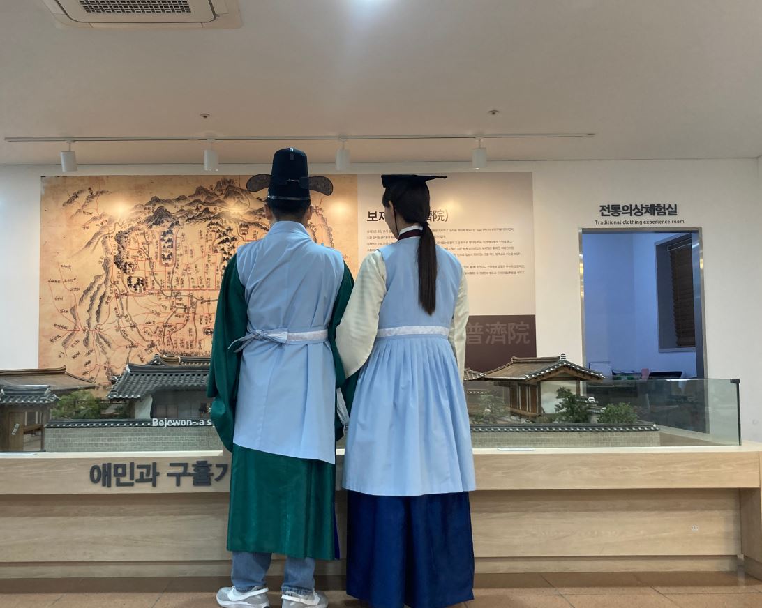1층 안내데스크 옆쪽에 위치한 전통의상 체험실은 예전 조선시대에 의관이나 의녀들이 입던 복장을 직접 입어볼 수 있는 곳입니다. 어른들과 아이들의 사이즈 의상이 모두 마련되어 있어서 부모님과 아이들이 함께 입고 기념촬영도 가능합니다.
