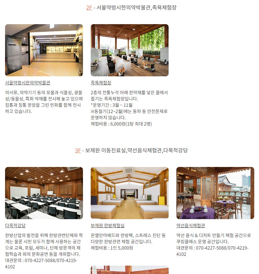3층에 위치한 보제원에서는 한방체험이 가능합니다. 은은한 아로마 향이 풍기는 아늑한 공간에서 기계식 온열 안마 매트와 발열안대를 통해 한의학의 경락과 경헐을 경험하고, 동백오일이 들어간 한방 손 팩과 지압으로 몸이 건강하고 아름다워지는 경험을 해 볼 수 있는 곳입니다.