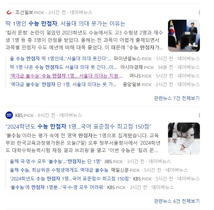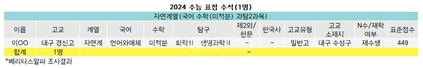 한편 2024학년도 수능에서 자연계열 표점 수석자로 추정되는 학생도 있다고 합니다. 이 학생은 대구의 일반고인 경신고 출신 재수생으로 만점자를 앞지른 ‘표점 수석’이라고 합니다. 이 학생은 수능 점수가 449점으로 탐구 선택과목에서 1개를 틀렸으며 자연계열 학생이라고 합니다.