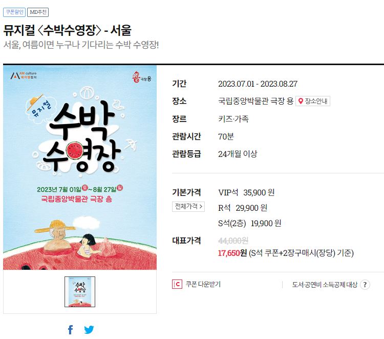 티켓은 인터파크, 위메프, 11번가에서 예매가 가능한데, 저는 위메프에서 할인쿠폰을 다운로드해서 예매했습니다. 현재 5%~15%까지 쿠폰이 발행되고 있고, vip석, R석, S석 각각 35,900원, 29,900원, 19,900원에 쿠폰 적용이 가능하니 할인카드와 쿠폰을 잘 활용하셔서 예매하시기 바랍니다. 위메프 할인 예매 시 타 사이트 보다 가격은 저렴하나, 사전 좌석지정이 되지 않고 현장에서 좌석 배정이 이루어지며, 티켓에도 초대권으로 표시되니 참고하시기 바랍니다.