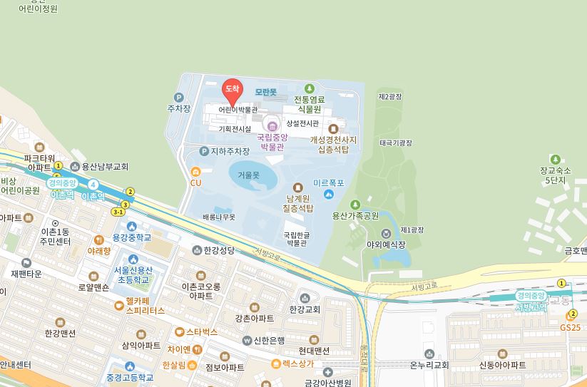 대중교통 이용 시 지하철 4호선 이촌역 2번 출구에서 도보로 약 10~15분 거리에 있고, 박물관 나들길을 이용하여 박물관 서문 쪽으로 이용이 가능합니다. 박물관 나들길은 국립중앙박물관과 연결된 이촌역 지하보도로 오전 7시부터 오후 11시까지 이용 가능하니 날씨가 더운 날에는 꼭 이용하셔서 이동하시는 것을 추천합니다.
