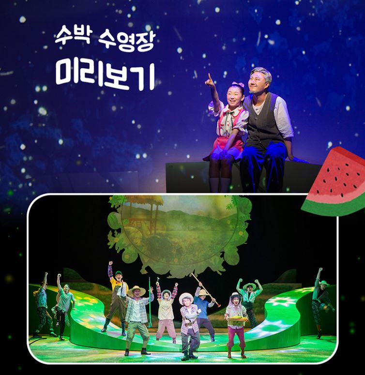 그림책을 모티브로 한 수박 수영장 뮤지컬은 감동적인 스토리가 더해져서 아이뿐만 아니라 함께 오신 부모님들도 즐겁게 관람이 가능한 공연입니다. 간략한 내용을 정리해 보면 맞벌이로 잘 놀아주지 못하는 주인공 진희의 부모님은 방학을 맞이한 진희에게 시골 외할아버지 댁으로 놀러 가게 하고, 부모님 보다 하루 먼저 도착한 진희에게 벌어지는 이야기를 담고 있습니다.