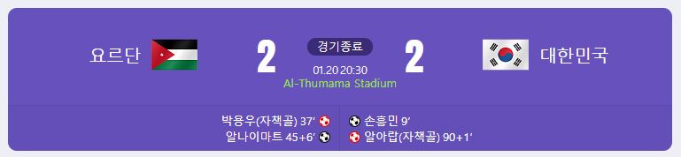 지난 1월 15일에는 한국과 바레인의 아시안컵 조별리그 첫 번째 경기가 열렸고, 1월 20일에는 한국과 요르단의 조별리그 두 번째 경기가 열렸습니다. 가장 먼저 경기 결과가 궁금하실 텐데요, 결과부터 말씀드리면 E조 조별리그 우리 대표팀의 두 번째 경기인 요르단과의 경기는 2:2 무승부로 마무리되었습니다.