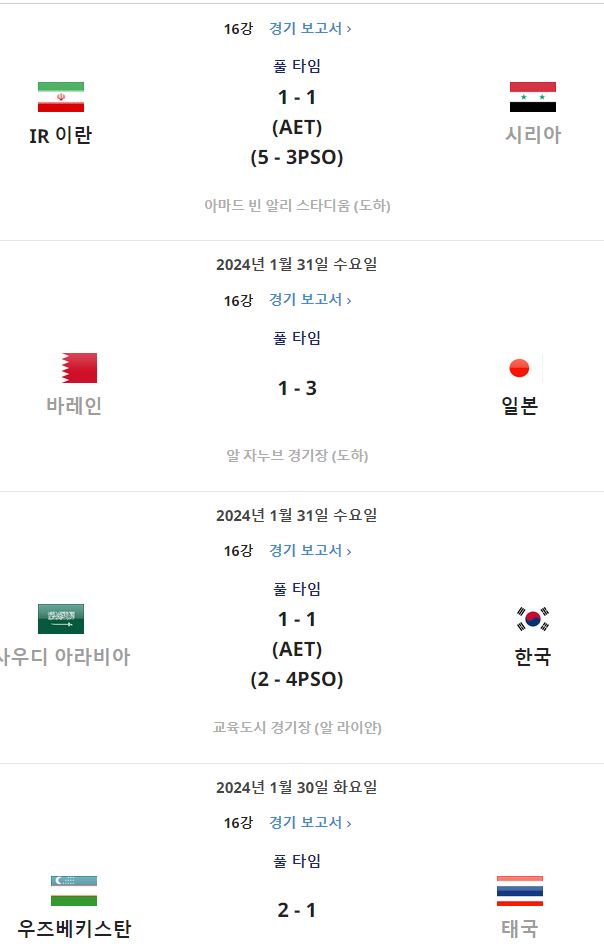 이번 카타르 아시안컵은 24개국이 출전해서 조별리그를 치르고, 조별 1,2위와 일부 3위 국가들이 16강에 진출했습니다. 16강에 진출한 국가들은 1월 28일부터 16강 경기를 진행했는데요, 16강 마지막 경기인 이란과 시리아의 경기가 2월 1일 새벽 마무리되면서 8강행 국가들이 모두 정해졌습니다. 16강 경기 결과를 살펴보면 다음과 같습니다.