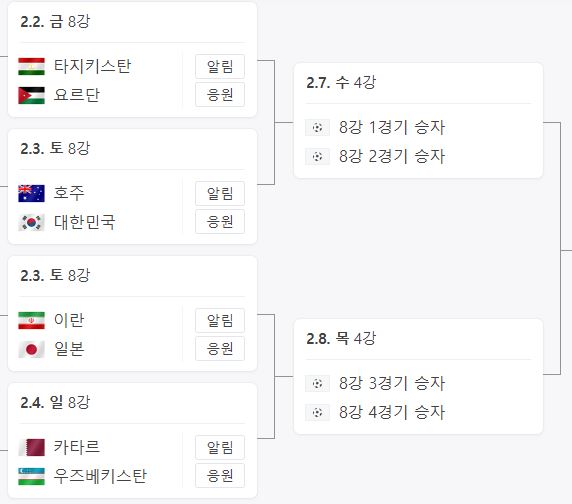 | 8강 3경기 | 이란 VS 일본 | 3경기 승자 VS 4경기 승자 (2월 8일 목) |