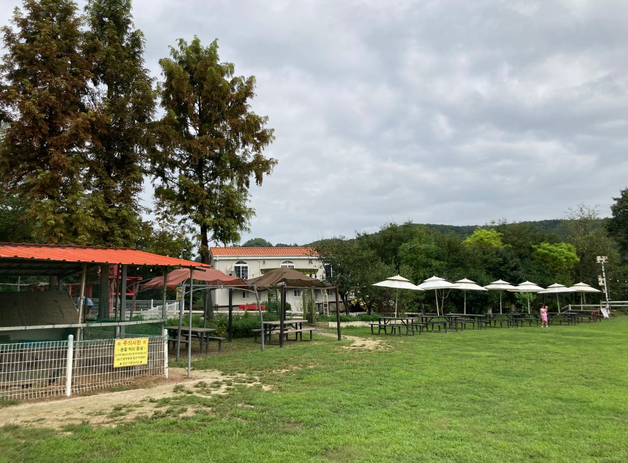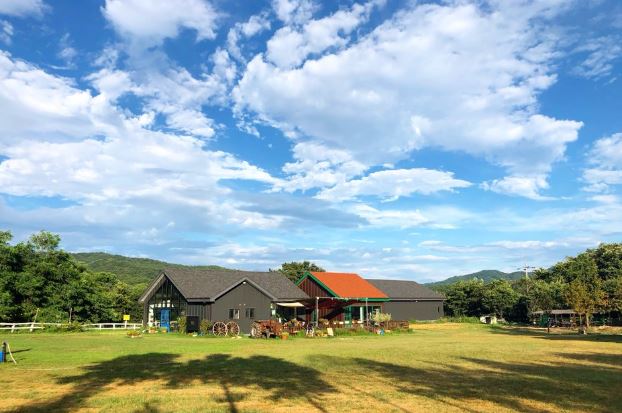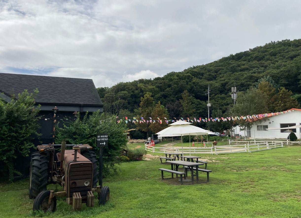 카페와 체험 장 사이 공간에 초원을 바라보며 아이들이 이용할 수 있는 모래놀이 장이 있습니다. 모래놀이 용품들도 구비가 되어 있으나, 혹시 위생상 염려되면 개인 놀이용품을 챙겨와서 모래놀이를 이용해 보시는 것도 좋습니다.