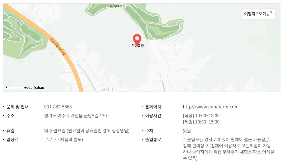 제가 방문해 보니 목장인 만큼 대중교통으로 방문은 불편하고 차량 이용을 권해드립니다. 서울에서 방문 시 영동고속도로 여주 IC에서 나와 국도를 이용해서 좀 돌아가야 진입로가 있어서 조금 불편하실 수도 있지만 목장치고는 접근성이 나쁘지 않고, 주변에 목장들이 많아서 찾기에도 어렵지 않았습니다.
