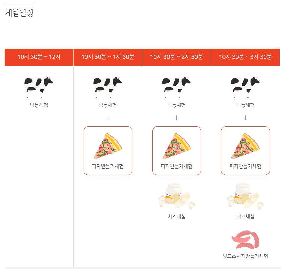 먼저 체험은 낙농체험을 기본으로 해서 피자 만들기 체험, 치즈 체험, 밀크 소시지 만들기 체험 등을 추가하는 형식입니다. 일반적으로 가장 많이 예약하시는 체험 프로그램은 낙농체험+피자 만들기 체험이고, 낙농체험만도 별도로 가능합니다.