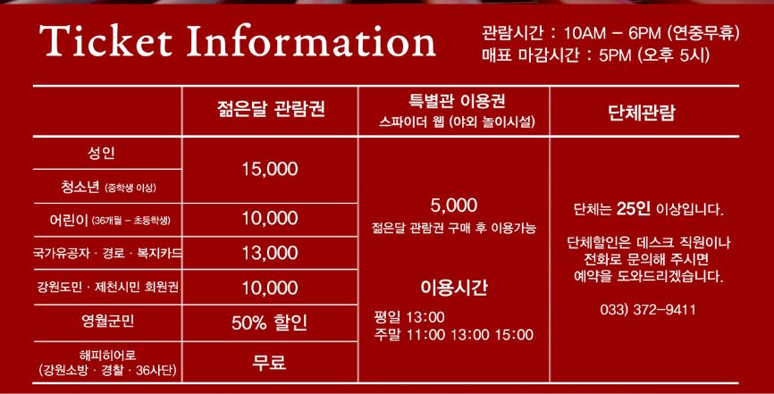 입장료 : 성인 3,000원 / 청소년 및 군인 2,500원 / 어린이 2,000원 / 경로 1,000원