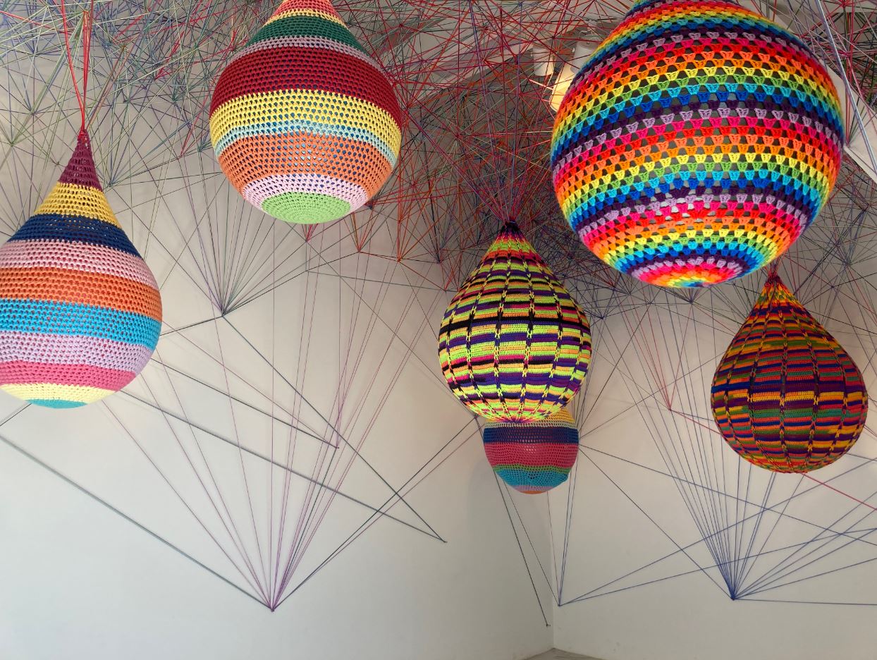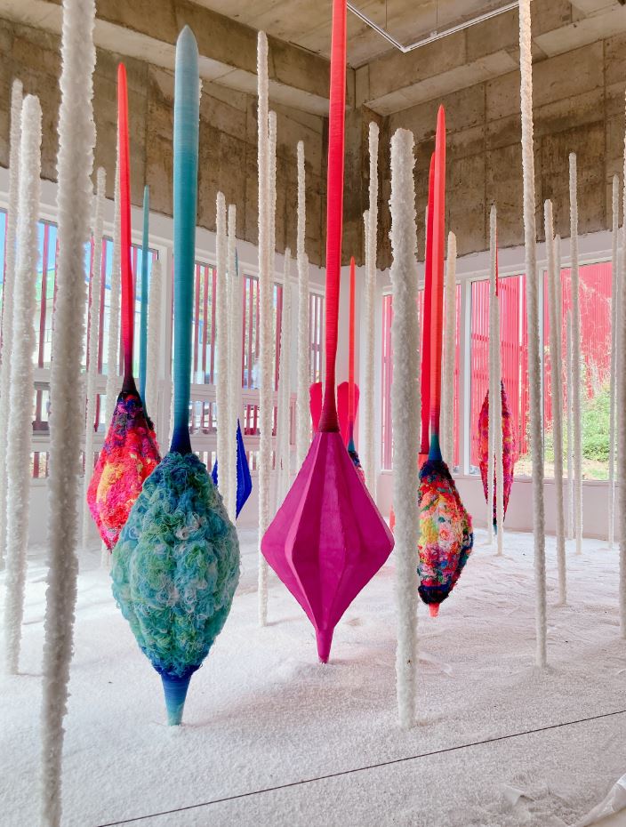 먼저 <붉은대나무>는 최옥영 작가의 설치미술 작품으로 입구부터 첫 공간을 장식하고 있으며 주변 영월의 자연 색인 녹색과 대비를 이루면서 젊은 달 와이파크를 대표하고 있습니다. 건물 몇 층 높이쯤 되는 길고 붉은 금속 파이프는 제목처럼 정말 대나무숲에 둘러싸인 느낌을 주기도 합니다. 그리고 입구부터 사진을 찍느라 들어가는 걸음이 느려지게 만들기도 합니다.