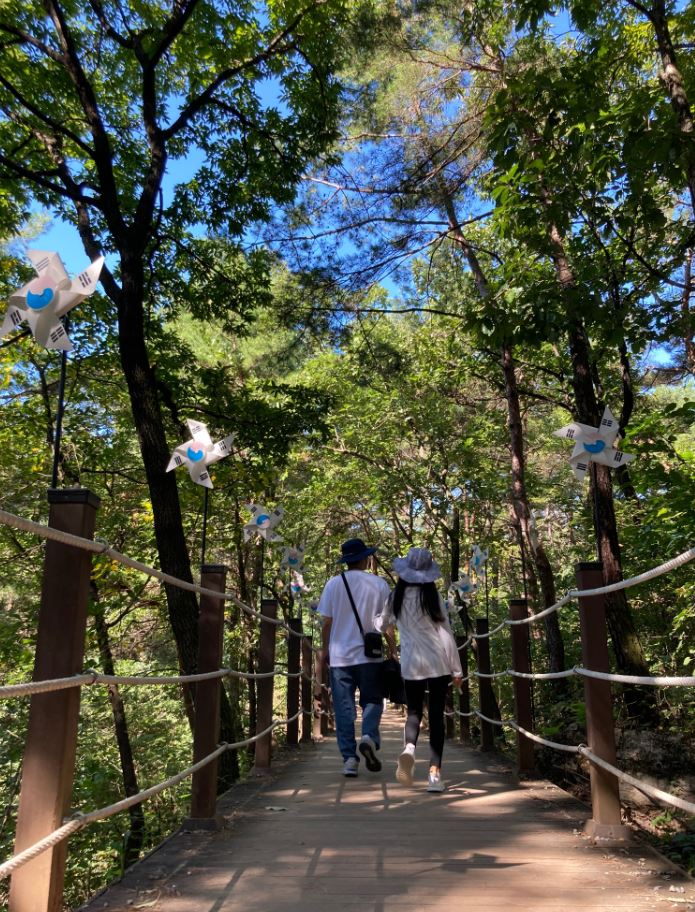 전망대는 계단으로 되어있는데 조금 위쪽 계단에 마련된 의자에 앉아서 잠시 한반도 지형을 바라보고 있으니, 나무 그늘 아래 솔솔 불어오는 산바람과 눈앞에 펼쳐진 경치까지 정말 더할 나위 없는 시간이었습니다.