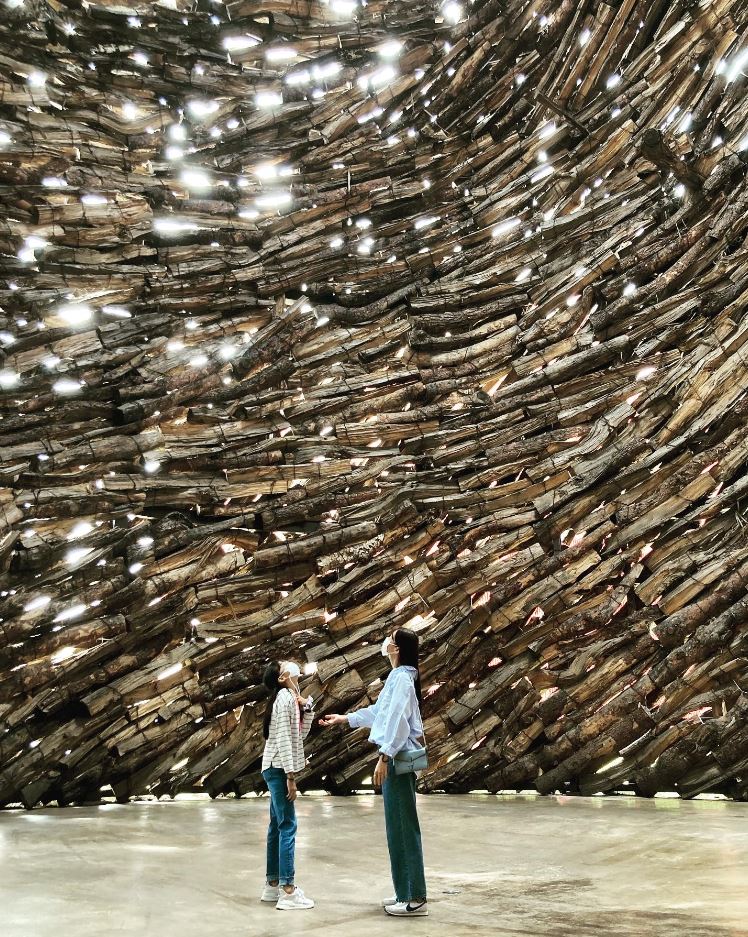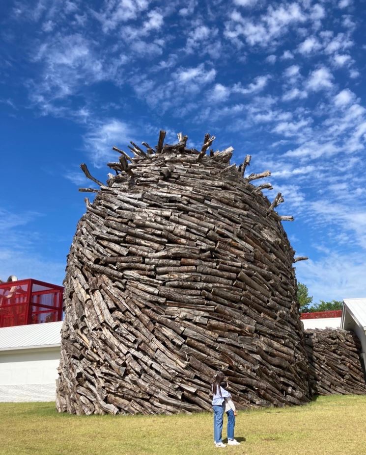 두 번째 <목성>은 거대한 규모로 영월의 소나무를 엮어서 만든 설치미술 작품입니다. 건물 몇 층 높이의 소나무 구조물은 내부를 통해서 그 안으로 지나갈 수 있고, 외부에서도 전체적인 모습의 감상이 가능합니다. 막상 내부에 들어서면 뭔지 모를 온화함과 따뜻함이 마치 엄마 배 속에 있는 듯한 느낌을 줍니다.