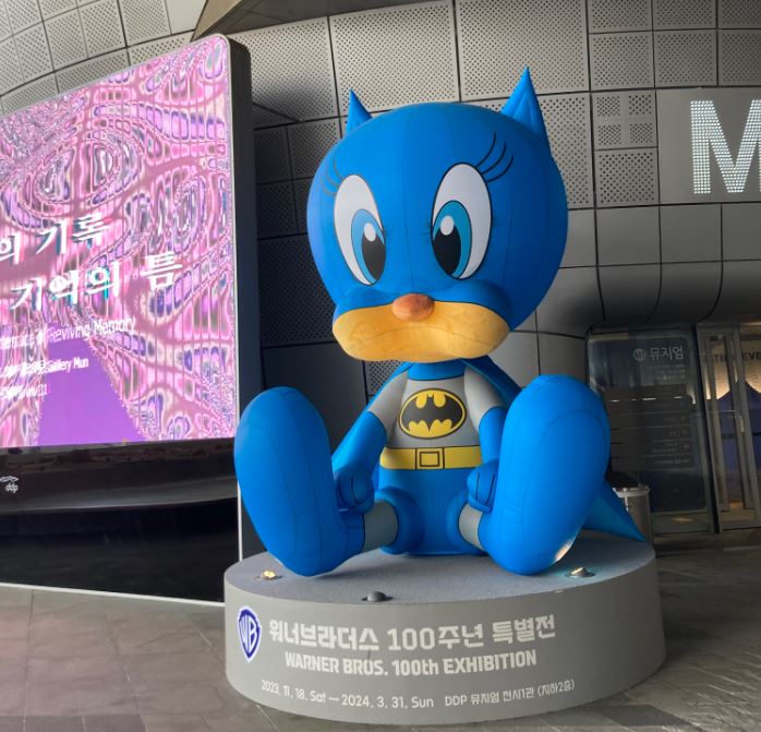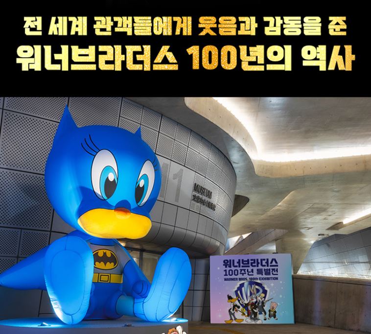 워너브라더스 100주년 특별 전시는 동대문 디자인 플라자(DDP) 뮤지엄 전시 1관 지하 2층에서 진행하고 있습니다. 전시장 주소는 서울 중구 을지로 281이고 지하 2층 DDP 뮤지엄 전시 1관입니다. 뮤지엄 전시 1관은 동대문 디자인 플라자 중앙에 위치하고 있어서 찾기 어렵지 않고, 특히나 전시관 외부에 배트맨 옷을 착용한 대형 캐릭터 인형이 설치되어 있어서 금방 찾을 수 있습니다.