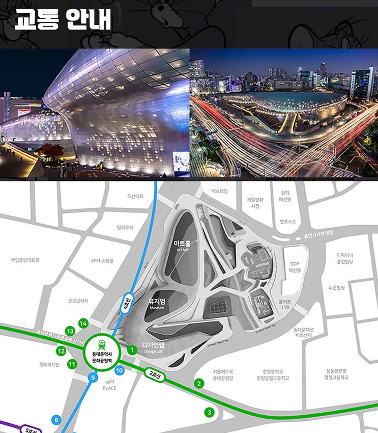 지하철을 이용하여 방문하시는 분들은 동대문역사문화공원역 (2,4,5호선) 1번 출구에서 도보로 3분 정도 거리이고, 어울림 광장과 DDP 마켓 근처가 전시장이라서 대중교통으로 방문하셔도 충분히 편리합니다.